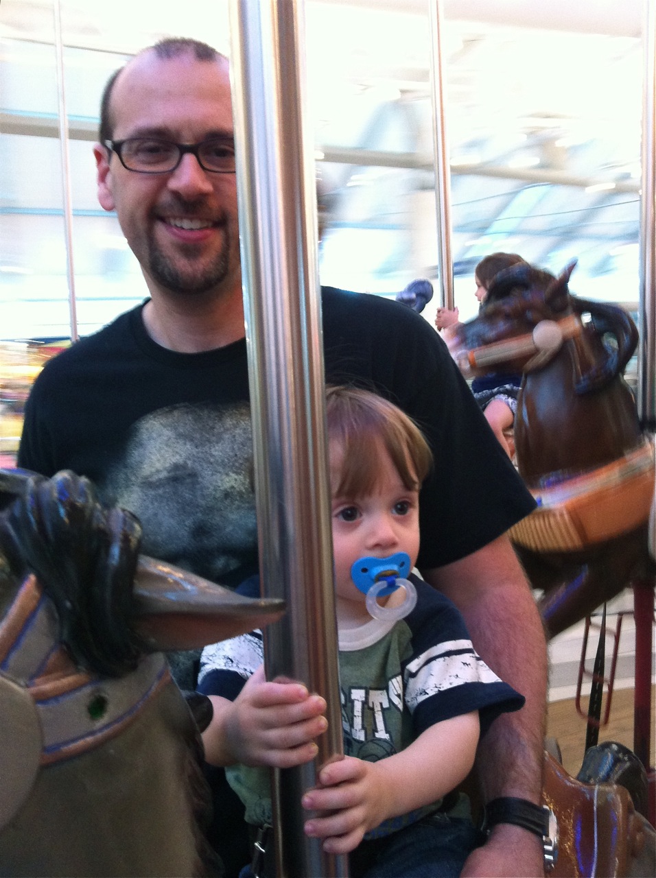 Riding the carousel at the mall with Daddy ... and binky. Ben was always a thumb sucker, but he got hooked on his binky at around 14 months old. He mostly chews on it when he's awake, especially when he's teething. He only has his four canine teeth left to come in and we plan on just using binky for naps and bed after that. If he doesn't have his binky he sucks his thumb raw, so the binky seems the better option for now.